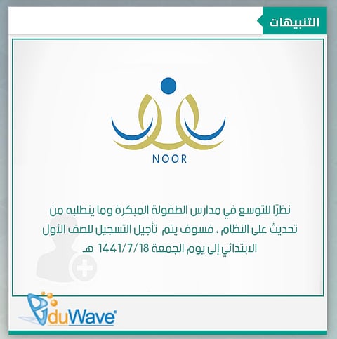 وتفصيلاً، عرض برنامج نور على موقعه الرسمي رسالة يوضح فيها أنه ونظراً للتوسع في نظام الطفولة المبكرة وما يتطلبه من تحديث النظام، فسوف يتم تأجيل التسجيل للصف الأول الابتدائي إلى يوم الجمعة 1441/7/18هـ.