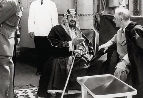 استطاع الملك المؤسس عبدالعزيز آل سعود -طيّب الله ثراه- بحنكته السياسية وذكائه الفائق؛ أن يؤسس أضخم علاقة استراتيجية في العالم، راسمًا ملامح الشرق الأوسط؛ منذ أكثر من 80 عامًا وحتى الآن، حاملًا في قلبه وبجميع لقاءاته؛ هموم أبناء وطنه وقضية الشعب الفلسطيني التي كانت محور حديث ونقاش أول لقاء جمع الملك المؤسس في الرئيس الأمريكي "روزفلت" في عام 1945 ميلادي، والذي بحث فيه أيضًا الملك عبدالعزيز - طيب الله ثراه - استقلال سوريا ولبنان؛ حيث وعده "روزفلت" بالدعم الكامل ماعدا استخدام القوة؛ حيث كان الملك عبدالعزيز خلال لقائه "روزفلت" يعبر عن وجهة نظر عربية وإسلامية، وعن حسّ العدالة البسيط الكامن في كل إنسان.