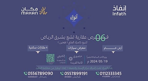 تعلن مكان المستثمر وبإشراف مركز الإسناد والتصفية "إنفاذ" وبقرار من محكمة التنفيذ، عن إقامة مزاد "أنواء" الهجين وذلك يوم 19 مايو 2024 حضورياً الساعة: 4:00 عصرًا في قاعة الفريدة بمدينة الرياض على طريق الثمامة، وإلكترونياً عبر منصة السعودية للمزادات من الساعة 4:00 عصراً حتى 7:00 مساءً.