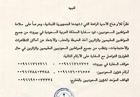 دعت سفارة المملكة في بيروت، المواطنين السعوديين؛ سواء المقيمين أو الزائرين في لبنان، إلى توخي الحيطة والحذر والابتعاد عن أماكن التظاهرات والاحتجاجات.
