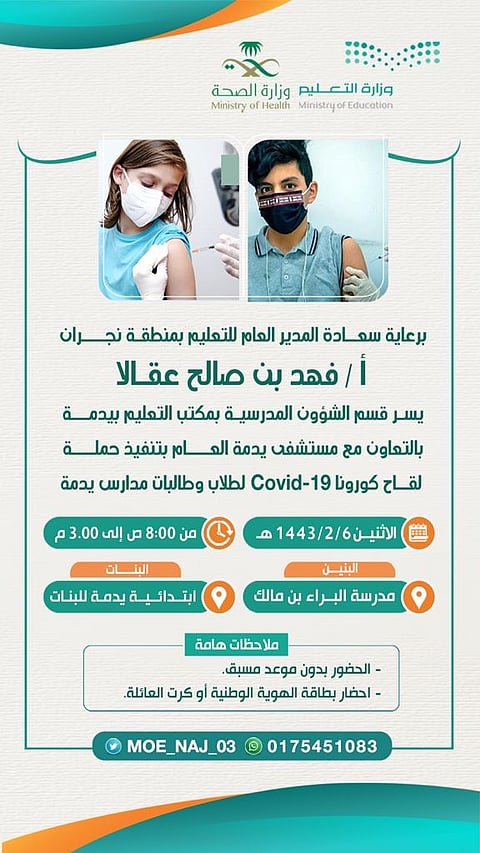 برعاية مدير عام التعليم بمنطقة نجران، فهد بن صالح بن عقالا، ينفّذ قسم الشؤون المدرسية بمكتب التعليم بمحافظة يدمة، حملة لقاح كورونا للطلاب والطالبات.