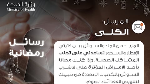 نصحت وزارة الصحة بتناول مزيد من السوائل بين فترتَي الفطور والسحور، من أجل المحافظة على صحة الكلى وتعويض الفقد في السوائل أثناء الصوم.