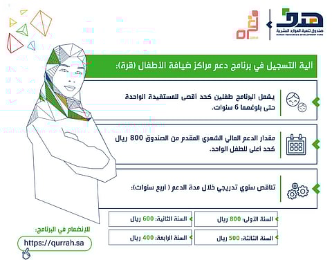 ويعد برنامج دعم مراكز ضيافة الأطفال للمرأة العاملة "قرة" مبادرة من صندوق تنمية الموارد البشرية، لدعم الكوادر النسائية الوطنية في سوق العمل والاستقرار فيه، عبر تسجيل أطفالهن في خدمة ضيافة الأطفال المرخصة.