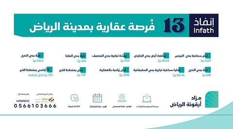 يعرض المزاد 13 فرص عقارية تجارية وسكنية وزراعية مميزة في مواقع استراتيجية في أهم الأحياء المميزة بمدينة الرياض
