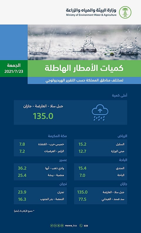 سجَّلت كمية الأمطار التي هطلت اليوم الجمعة على جبل سلا بمحافظة العارضة بمنطقة جازان أعلى نسبة لكميات هطول الأمطار على مستوى السعودية؛ إذ بلغت الكمية 135.0 ملم، حسب ما سجلته محطات الرصد الهيدرولوجي والمناخي بالسعودية. وتلا جبل سلا سد ضمد العيدابي بمنطقة جازان أيضًا؛ إذ بلغت كمية الأمطار 77.5 ملم.