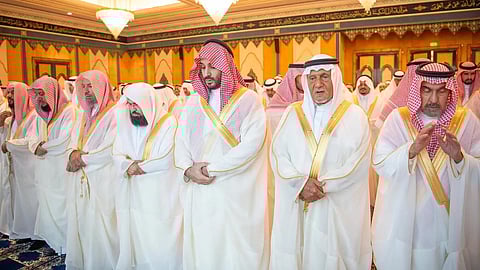 وأدى الصلاة مع سمو ولي العهد وحضر الاستقبال: الأمير تركي بن فيصل بن عبدالعزيز، الأمير خالد بن سعد بن عبدالعزيز، الأمير محمد بن مشاري بن عبدالعزيز، الأمير محمد بن فهد بن محمد بن عبدالرحمن، الأمير تركي بن إبراهيم بن مشاري، الأمير سلطان بن ناصر بن عبدالعزيز، الأمير منصور بن مشعل بن عبدالعزيز، الأمير خالد بن بندر بن عبدالعزيز مستشار خادم الحرمين الشريفين، الأمير فيصل بن مساعد بن عبدالرحمن، الأمير متعب بن ثنيان بن محمد، الأمير الدكتور بندر بن عبدالله بن تركي، الأمير الدكتور فيصل بن محمد بن سعود بن عبدالعزيز، الأمير خالد بن محمد بن تركي، الأمير الوليد بن طلال بن عبدالعزيز، الأمير خالد بن ثنيان بن محمد، الأمير خالد بن محمد بن سعود الكبير، الأمير تركي بن عبدالله بن محمد بن عبدالرحمن، الأمير نواف بن محمد بن عبدالله، الأمير الدكتور خالد بن عبدالله بن مشاري، الأمير الدكتور مشعل بن عبدالله بن عبدالعزيز بن مساعد، الأمير الدكتور تركي بن سعود بن محمد، الأمير مشعل بن ماجد بن عبدالعزيز مستشار خادم الحرمين الشريفين، الأمير وليد بن عبدالمحسن بن عبدالعزيز، الأمير الدكتور سعود بن سلمان بن محمد، الأمير يوسف بن مساعد بن عبدالعزيز، الأمير عبدالعزيز بن ماجد بن عبدالعزيز، الأمير منصور بن ناصر بن عبدالعزيز، الأمير الدكتور نايف بن ثنيان بن محمد، الأمير عبدالعزيز بن أحمد بن عبدالعزيز، الأمير الدكتور بندر بن سلمان بن محمد، الأمير بندر بن خالد بن فيصل بن عبدالعزيز المستشار في الديوان، الأمير متعب بن سعود بن سعد، الأمير نواف بن سعود بن سعد، الأمير عبدالرحمن بن مساعد بن عبدالعزيز، الأمير سلطان بن خالد بن فيصل بن عبدالعزيز، الأمير تركي بن عبدالله بن عبدالعزيز بن مساعد، الأمير بندر بن فهد بن محمد بن عبدالعزيز، الأمير سعود بن سعد بن محمد، الأمير فيصل بن سلمان بن عبدالعزيز المستشار الخاص لخادم الحرمين الشريفين، الأمير خالد بن تركي بن فيصل، الأمير فيصل بن مقرن بن عبدالعزيز، الأمير مشعل بن متعب بن ثنيان، الأمير عبدالعزيز بن هذلول بن عبدالعزيز، الأمير نواف بن سعد بن عبدالله، الأمير فيصل بن تركي بن فيصل بن عبدالعزيز، الأمير نواف بن فيصل بن فهد بن عبدالعزيز، الأمير عبدالعزيز بن فهد بن عبدالعزيز، الأمير فيصل بن سعود بن عبدالله بن فيصل، الأمير سعد بن عبدالرحمن بن سعد، الأمير سلمان بن فيصل بن سلمان، الأمير نايف بن سلطان بن عبدالعزيز، الأمير تركي بن محمد بن فهد بن عبدالعزيز وزير الدولة عضو مجلس الوزراء، الأمير محمد بن عبدالرحمن بن عبدالعزيز نائب أمير منطقة الرياض، الأمير سعود بن نهار بن سعود بن عبدالعزيز محافظ الطائف، الأمير فيصل بن محمد بن سعد، الأمير سلطان بن فهد بن سلمان بن عبدالعزيز، الأمير عبدالعزيز بن تركي بن فيصل بن عبدالعزيز وزير الرياضة، الأمير خالد بن عبدالعزيز بن عبدالله بن جلوي، الأمير عبدالعزيز بن سعود بن فهد بن عبدالعزيز، الأمير سعود بن محمد بن عبدالله بن فيصل بن عبدالعزيز، الأمير سلمان بن بندر بن محمد، الأمير فهد بن تركي بن فيصل بن تركي نائب أمير منطقة القصيم، الأمير عبدالله بن بندر بن عبدالعزيز وزير الحرس الوطني، الأمير سلطان بن عبدالله بن سعود بن عبدالعزيز، الأمير سلطان بن محمد بن سعد، الأمير عبدالله بن سعد بن عبدالعزيز، الأمير عبدالعزيز بن محمد بن سعد بن عبدالعزيز، الأمير سعود بن سلمان بن عبدالعزيز، الأمير مشعل بن سلطان بن عبدالعزيز، الأمير خالد بن حسام بن سعود، الأمير سلطان بن محمد بن عبدالله بن فيصل بن عبدالعزيز، الأمير سعود بن تركي بن فيصل بن عبدالعزيز، الأمير خالد بن سلمان بن عبدالعزيز وزير الدفاع، الأمير مساعد بن عبدالله بن مساعد، الأمير سلطان بن تركي بن سعد، الأمير عبدالله بن سلطان بن ناصر بن عبدالعزيز، الأمير محمد بن سلطان بن ناصر بن عبدالعزيز، الأمير عبدالعزيز بن فيصل بن عبدالمجيد بن عبدالعزيز، الأمير سعد بن عبدالله بن عبدالعزيز، الأمير سعود بن سلطان بن ع