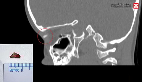 وأوضح أن نتائج الفحوصات كشفت عن وجود جسم غريب بطول 1 سم وعرض 4 مللم، في محجر العين اليمنى، بالمنطقة الواقعة ما بين العظم والعين، مع عدم وجود أية عدوى أو التهابات وسلامة المقلة.. وعلى الفور تم التدخل الجراحي العاجل؛ وذلك للحيلولة دون إصابة الطفل بالعدوى، أو حدوث أية مضاعفات قد تصل إلى فقدان الرؤية لا سمح الله.