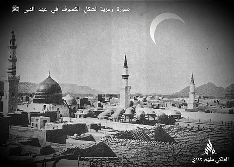 أكد الباحث الفلكي "ملهم بن محمد هندي" عضو الاتحاد العربي لعلوم الفلك والفضاء، أن الكسوف الحلقي للشمس الذي سيحدث غدًا الأحد، يُشابه جدًّا الكسوف الذي وقع في عهد النبي ﷺ، والذي وافق يوم وفاة ابنه إبراهيم؛ حيث وقع الكسوف في ذات اليوم في التاسع والعشرين من شهر شوال، وكان الكسوف حلقيًّا أيضًا ومارًّا بجنوب الجزيرة العربية، وتمت مشاهدته بشكلٍ جزئي من المدينة المنورة بنسبة ٧٦%، وحدث بين الساعة ٧ إلى الساعة ١٠ صباحاً، وأنه سيكون مشهد الكسوف في المدينة المنورة مطابقًا لما شهده النبي ﷺ وصحابته رضوان الله عليهم.