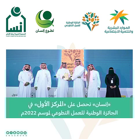 سلم المهندس أحمد بن سليمان الراجحي، وزير الموارد البشرية والتنمية الاجتماعية، الجائزة الوطنية للعمل التطوعي 2022" في مسار تفعيل العمل التطوعي، للجمعية الخيرية لرعاية الأيتام بمنطقة الرياض "إنسان" لحصولها على المركز الأول، وتسلم درع التكريم محمد بن سعد المحارب مدير عام الجمعية.