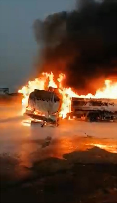 ورصدت مقاطع فيديو حجم الحريق الذي اندلع قبل نحو ساعة في شاحنتي نقل المشتقات البترولية، ولم تذكر المعلومات الأولية وقوع إصابات حتى وقت نشر هذا الخبر.