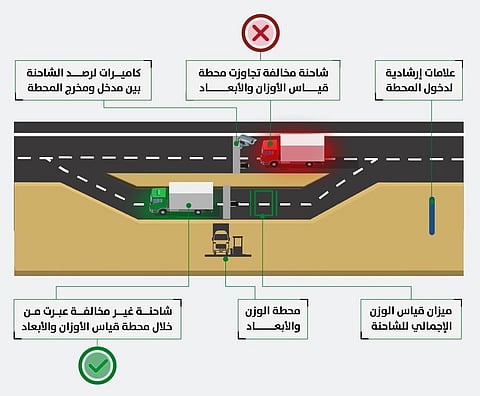 ونشر المرور رسمًا توضيحيًّا لمحطة الوزن وكيفية تسجيل المخالفة فيها.