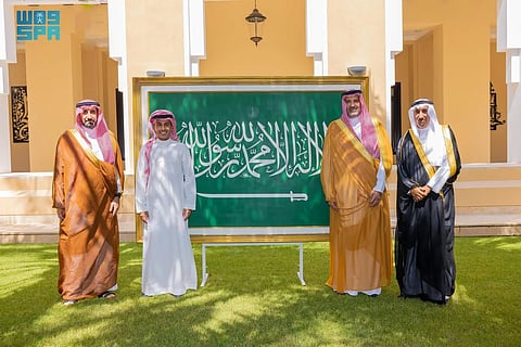 وأشاد بجهود الخطاط "المجحدي" في تنفيذ هذا العمل المميز بالتزامن مع اليوم الوطني، ووجّه بإيداع اللوحة في دارة الملك عبدالعزيز لتكون ضمن مقتنياتها؛ تقديرًا لقيمتها الفنية، ومضمونها العميق المنطلق من الإيمان بقيمة العلَم السعودي كرمز للوطن وقيادته الحكيمة، وتجسيدًا لارتباطه الروحي والتاريخي بالمملكة ورموزها، مؤكدًا أن مثل هذه الأعمال التي تعبر عن التراث والقيم الوطنية، إحدى وسائل التعبير عن الفخر والولاء والانتماء لهذا الوطن.