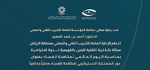 نظمت الإدارة العامة للتدريب التقني والمهني بمنطقة الرياض -ممثلة في الكلية التقنية للبنين بالقويعية- ندوة افتراضية بعنوان "دور المملكة الاستراتيجي لمكافحة الفساد محليًّا وعالميًّا"، احتفاءً باليوم الدولي لمكافحة الفساد برعاية محافظ المؤسسة العامة للتدريب التقني والمهني الدكتور أحمد بن فهد الفهيد.