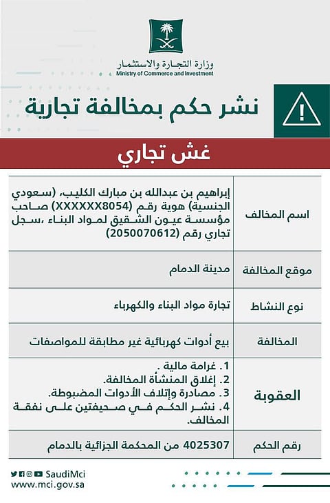 شهرت وزارة التجارة والاستثمار بصاحب مؤسسة تجارية إثر صدور حكم قضائي بإدانته بمخالفة نظام مكافحة الغش التجاري بحيازة وبيع أدوات كهربائية غير مطابقة للمواصفات والمقاييس بمدينة الدمام تضمنت 229 قطعة أفياش كهربائية.