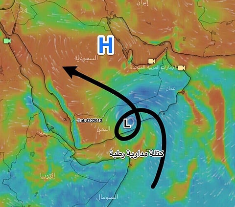وأوضح "رجاء" أن هذه الحالة الناتجة عبارة عن كتلة مدارية رطبة قادمة تشكلت في بحر العرب ستدخل إلى الجزيرة، حيث تصبح الرياح جنوبية شرقية محملة بالرطوبة في طبقات الجو نتيجة وجود بلك مرتفع ( H ) شرقي سيبيري يدفع بالرياح الرطبة المحملة بالرطوبة إلى البحر الأحمر، حيث يحتضن المنخفض الحراري الرطب لتصبح الرياح جنوبية شرقية في عدد من المناطق يقابله نزول علوي بارد فوق البحر الأحمر بدءًا من ٨ نوفمبر ومعه بداية تشكل حالة مطرية وتشتد مع بداية الثلث الثاني من نوفمبر تشمل القطاع الغربي وحائل والمدينة والقصيم وشمال الوسطى وغربها تمتد إلى شمال المملكة كبيرة قادمة بمشيئة الله.