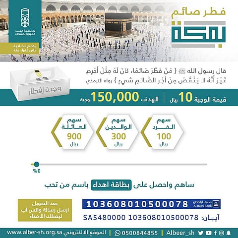 وأشارت الجمعية بأن قيمة الوجبة الواحدة 10 ريالات، وتستهدف 150 ألف وجبة صائم. كما حددت للمساهمين أسهماً للبذل والعطاء: سهم الفرد 100 ريال، وسهم الوالدين 300 ريال، وسهم العائلة 900 ريال.