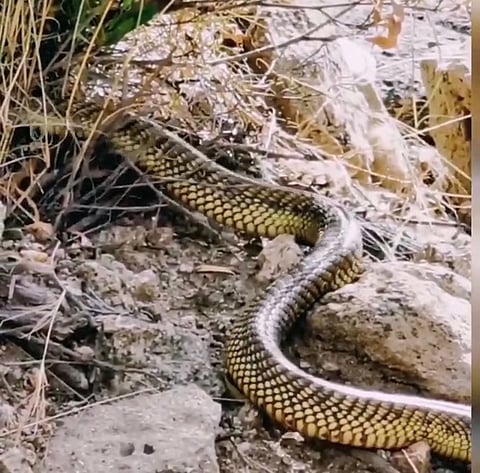 وقال "الشهري": كنت أقود مركبتي ظهر اليوم، الأربعاء ،في طريق جبل مومة، غرب محافظة تنومة، وتفاجأت بوجود ثعبان ضخم يقطع الطريق ويبلغ طوله أكثر من مترين.