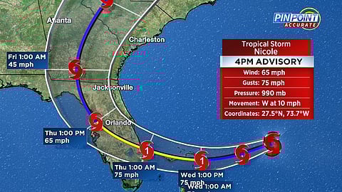 وأشار الخبراء إلى أن عاصفة "نيكول" تتجه من شمال غرب جزر الباهاما والساحل الأطلسي إلى فلوريدا، ومن المحتمل أن تتحول إلى إعصار خطير.