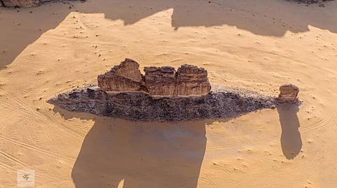 وعن هذه الصورة، قال خالد العنزي، إنه دائماً يخرج للاستكشاف والتصوير في صحارى العلا ويبحث دائماً عن النقوش الأثرية القديمة والتشكيلات الصخرية الغريبة باستخدام الكاميرا وطائرة الدرون، كما أشار إلى أنه "أثناء التصوير في صحراء وجبال المعتدل شاهدت هذه الصخرة التي تشكلت وتحولت منذ آلاف السنين، وانتظرت حتى تغرب الشمس لكي أحصل على فيديو صافٍ وواضح يظهر معالمها بشكل أفضل".