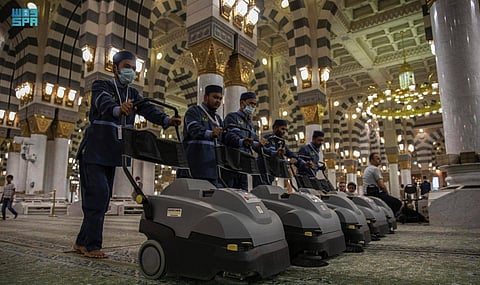 وتغسل أرضيات المسجد النبوي وساحاته وسطحه خمس مرات يومياً، كما تعطر الأرضيات والسجاد بأجود أنواع الورد المديني، كما يجري تنظيف وتعقيم 25000 سجادة يومياً، إضافة إلى تعقيم وتطهير مرافق المسجد النبوي ودورات المياه خمس مرات يومياً.