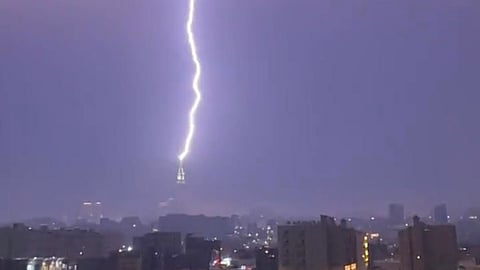 والتقطت عدسة المصور محمد الهذلي صاعقة رعدية تضرب برج الساعة في مكة المكرمة.