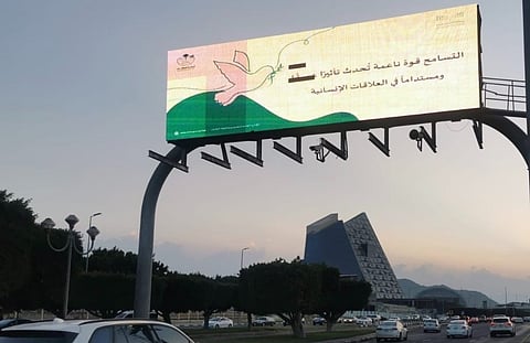 وحملت تلك اللوحات والشاشات في الميادين عبارة "التسامح قوة ناعمة تحدث تأثيرًا عميقًا، ومستدامًا في العلاقات الإنسانية".