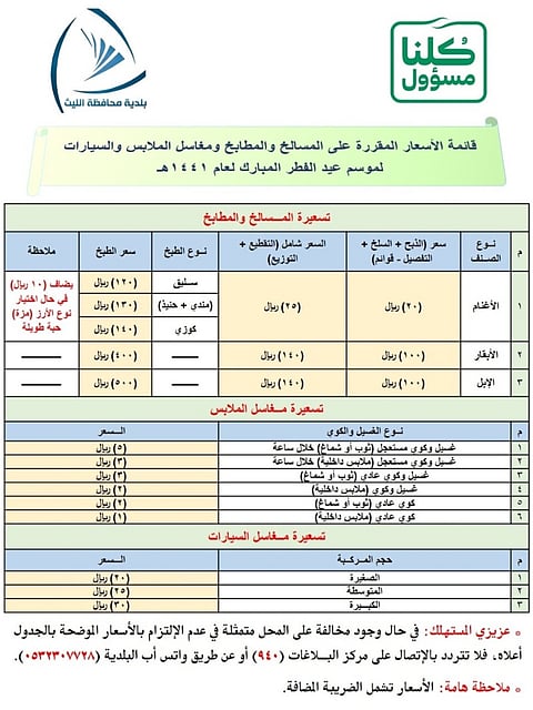 قامت بلدية محافظة الليث بتحديد قائمة الأسعار المقررة على المسالخ والمطابخ الشعبية ومغاسل الملابس والسيارات لموسم عيد الفطر المبارك لعام ١٤٤١هـ، وذلك ضمن نطاق اختصاصات البلدية في الإشراف والرقابة المباشرة على الأنشطة التجارية، والتي ينطوي تحتها مراقبة الأسعار للسلع غير المُنتجة،