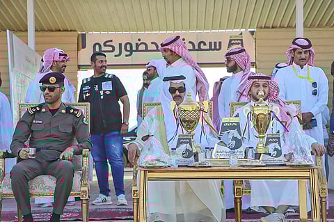 وفي ختام السباق توج محافظ العقيق الفائزين في المحفل الأول لسباقات الخيل للعام الحالي.