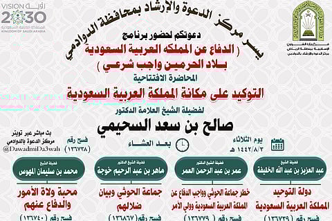 ينظِّم مركز الدعوة والإرشاد بمحافظة الدوادمي برنامج "الدفاع عن المملكة العربية السعودية (بلاد الحرمين) واجب شرعي"، خلال الفترة من 3 إلى 16 شعبان، وذلك من منطلق الدفاع عن بلاد الحرمين مهبط الوحي والرسالة.