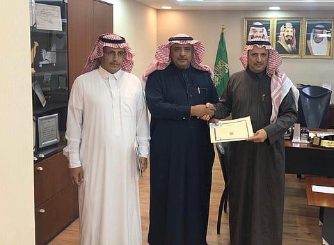 سلم مدير عام التدريب التقني والمهني بمنطقة نجران سعيد آل جبار بطاقة (مدرب معتمد) لسعادة مدير عام هيئة السياحة صالح آل مريح في مجال السياحة والفندقة والضيافة وتطوير الذات.