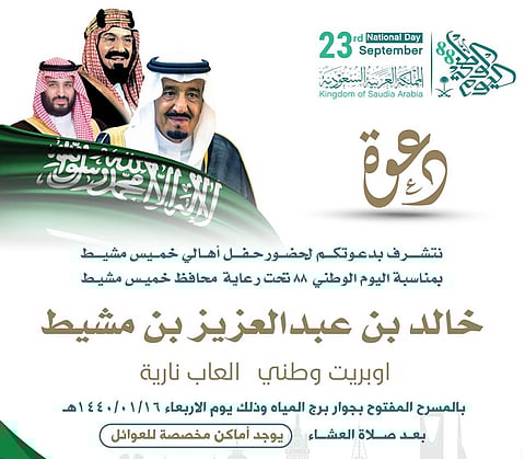 تحتفل محافظة خميس مشيط، ممثلة بلجنة التنمية السياحية وجميع الدوائر الحكومية بالمحافظة، بذكرى اليوم الوطني المجيد برعاية محافظ خميس مشيط خالد بن عبدالعزيز بن مشيط، من خلال تخصيص عدة مواقع للاحتفالات ولعدة أيام.