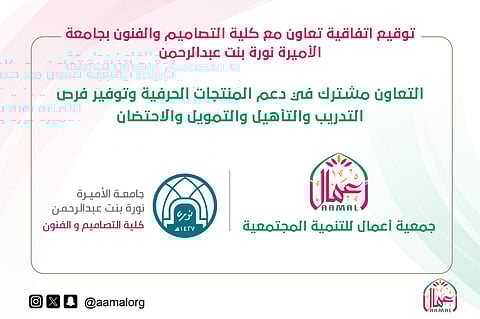 وقّعت جمعيةُ أعمال للتنمية المجتمعية، اتفاقيةَ تعاون مشترك مع جامعة الأميرة نورة بنت عبدالرحمن، ممثلة في كلية التصاميم والفنون، ووقّع الاتفاقيةَ من جانب الجمعية