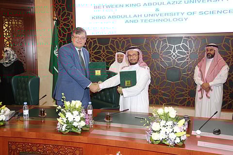 وقّع نائب رئيس جامعة الملك عبدالله للأبحاث الدكتور دونال برادلي، ووكيل جامعة الملك عبدالعزيز للدراسات العليا والبحث العلمي يوسف التركي، بعد ظهر اليوم، بحضور رئيس كاوست الدكتور توني تشان، ومدير جامعة الملك عبدالعزيز الدكتور عبدالرحمن اليوبي، اتفاقية تعاون مشترك تأكيدًا للشراكة الممتدة بين الجامعتين منذ سنوات.