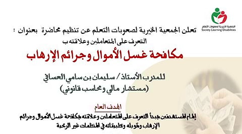 نظمت الجمعية الخيرية لصعوبات التعلم عبر برنامج الزووم محاضرة عن التعرف على المتعاملين وعلاقته بمكافحة غسل الأموال وجرائم الإرهاب، قدمها سليمان بن سامي العسافي، مستشار مالي ومحاسب قانوني.