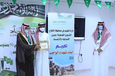 تلا ذلك تكريم أبناء شهداء الوطن من قِبَل قسم الإرشاد الطلابي بتعليم الأفلاج، بعدها اطلع على درس تعليمي يبث للطلاب بالقاعة الافتراضية بمقر التجهيزات المدرسية.