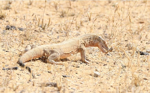 ويُعد الورل الصحراوي أحد أكبر الزواحف الصحراوية في المملكة وأكثرها قدرة على التكيّف مع البيئة القاسية، ويتميّز بجسمه الكبير الذي يتجاوز طوله المتر، ورأسه الطويل النحيل، وذيله القوي المُزيّن بحلقات داكنة يستخدمها للدفاع عن نفسه. كما يتمتع ببصر حاد ولسان مشقوق طويل وأسنان قوية، بينما يساعده لونه الرملي المائل إلى الصفرة والمغطى ببقع صغيرة على التمويه والتخفي داخل بيئته الطبيعية.