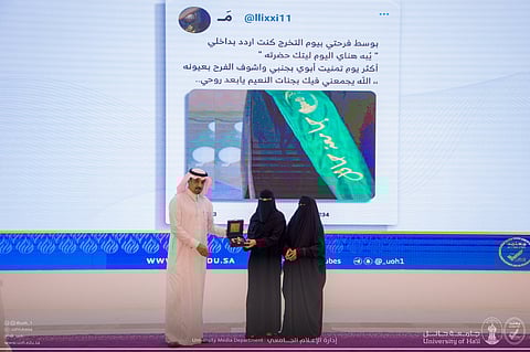 في لفتة إنسانية وأبوية حانية، كرَّم رئيس جامعة حائل الدكتور راشد الشريف، الطالبة مرزوقة سالم؛ التي غرّدت في يوم حفل تخرُّج الجامعة، مخاطبة والدها المُتوفى الذي تمنت حضوره.