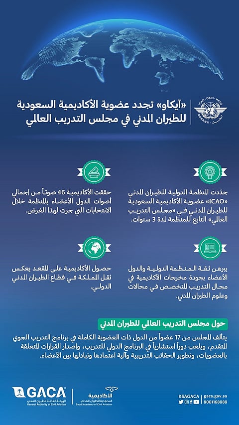 جدّدت المنظمة الدولية للطيران المدني عضوية الأكاديمية السعودية للطيران المدني @SACA_SA بمجلس التدريب العالمي للطيران التابع لـ"الإيكاو" لمدة ثلاث سنوات.