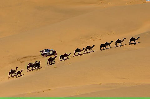 وثَّقت وكالة "رويترز" بالصورة مشهدًا ساحرًا للإبل العربية الأصيلة وهي مصطفة خلف بعضها، وتمشي الهوينى على الكثبان الرملية للصحراء، فيما يتنافس المتسابقون بالقرب منها خلال منافسات "رالي داكار السعودية".