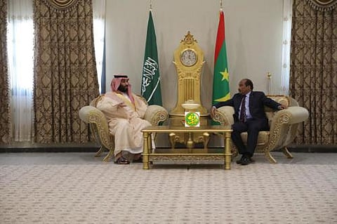 عقد ولي العهد صاحب السمو الملكي الأمير محمد بن سلمان بن عبدالعزيز آل سعود جلسة مباحثات مع الرئيس الموريتاني محمد ولد عبدالعزير، اليوم الأحد، بالجناح الرئاسي بمطار نواكشوط الدولي.