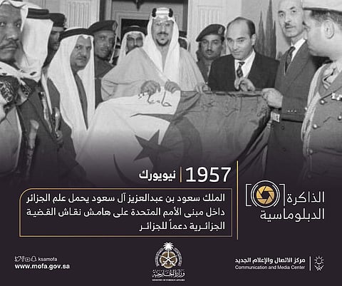 نشر حساب وزارة الخارجية على "تويتر" صورة للملك سعود بن عبدالعزيز يحمل علم #الجزائر داخل مبنى الأمم المتحدة في #نيويورك.