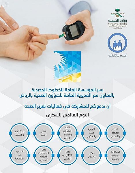 تنظم المؤسسة العامة للخطوط الحديدية، بالتعاون مع المديرية العامة للشؤون الصحية بالرياض، يوم غد الأربعاء، فعالية "احم عائلتك"، تزامنًا مع اليوم العالمي للسكري، في جميع القطارات المتوجهة من محطة الرياض إلى المنطقة الشرقية، وأخرى بمركبات تجوب مختلف محافظات الرياض.