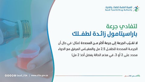 وقالت الهيئة، عبر حسابها في "تويتر"؛ لتفادي جرعة "باراسيتامول" زائدة: لا تقرب الجرعة إلى جرعة أكثر من المحدّد؛ مبينة أنه في حال أن الجرعة المحدّدة للطفل (2.5 مل) والمقياس المرفق مع الدواء محدّدٌ على (2) أو (3)، في هذه الحالة يُفضل أخذ (2 مل).