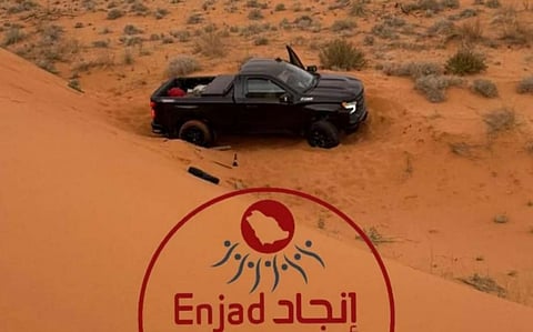 وتفاعل فريق "إنجاد" مع البلاغ، وقام بـ3 مراحل للبحث في المنطقة بعدد من المركبات المجهزة، وطائرات الدرون، والطيران الشراعي؛ وهو ما أسفر في النهاية عن العثور عليه.