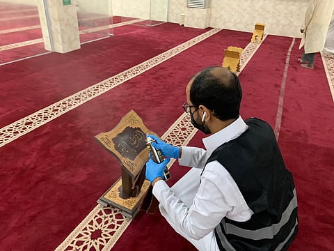 واستطردت، تمّت تهيئة المساجد ووضع الملصقات الإرشادية للتباعد بين المصلين وتنظيف وتعقيم المساجد، كما تم وضع اللوحات الإرشادية عند أبواب المساجد لتوعية المصلين بأهمية اتخاذ الإجراءات الاحترازية للحد من انتشار فيروس كورونا.