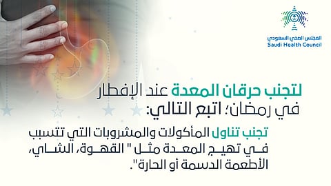 وقال المجلس في رسالته التوعوية عبر حسابه على تويتر: لتجنُّب حرقان المعدة بعد الإفطار في رمضان؛ يجب الابتعاد عن تناول المأكولات والمشروبات التي تتسبّب في تهيج المعدة؛ مثل القهوة، والشاي، والأطعمة الدسمة، أو الحارة.