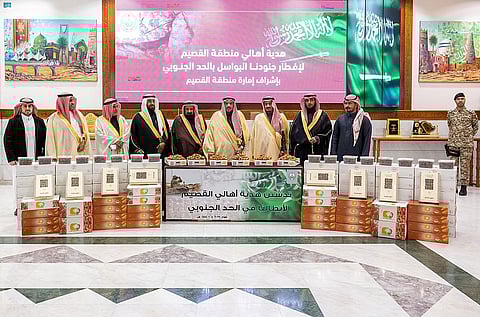 دشّن أمير منطقة القصيم الدكتور فيصل بن مشعل بن سعود بن عبدالعزيز، بالإمارة، اليوم، هدية أهالي المنطقة لأبطال الحد الجنوبي من التمور، التي تمثل تسيير 20 شاحنة محمّلة بـ160 طنًا من التمور، و16 ألف كرتون مياه، ستوجه إلى ثلاث مناطق بالحد الجنوبي.
