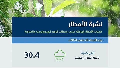 سجّلت منطقة القصيم أعلى معدل لكميات هطول الأمطار بـ (30.4) ملم في محطة القطار، وذلك ضمن (6) مناطق شهدت هطول كميات متفرقة من الأمطار حتى صباح الأربعاء 20 مارس 2024م.