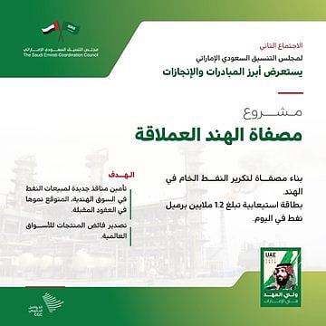 شهد عقد الاجتماع الثاني لمجلس التنسيق السعودي الإماراتي أمس في أبوظبي، حيث رأس ولي العهد الأمير محمد بن سلمان الجانب السعودي، ورأس ولي عهد أبوظبي الشيخ محمد بن زايد الجانب الإماراتي، استعراض سبع مبادرات إستراتيجية، من بينها بناء مصفاة للنفط والبتروكيماويات في الهند، فما الطاقة الاستيعابية للمصفاة؟ وكم ستبلغ تكلفتها؟ وما الهدف منها؟ وأين ستنشأ؟