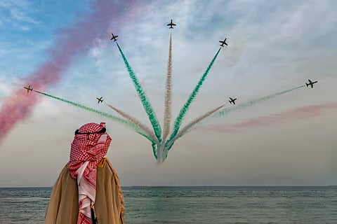 انطلقت، أمس، العروض الجوية لفريق القوات الجوية الملكية السعودية "الصقور السعودية"، ضمن فعاليات يوم التأسيس التي تنظّمها الهيئة الملكية بالجبيل؛ ممثلة في إدارة الخدمات الاجتماعية، وذلك على شاطئ الفناتير بمدينة الجبيل الصناعية.